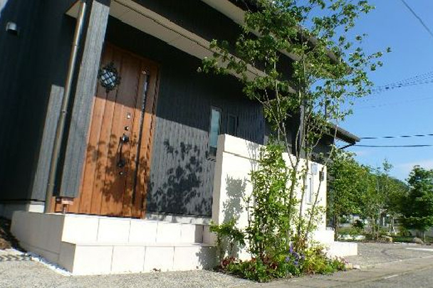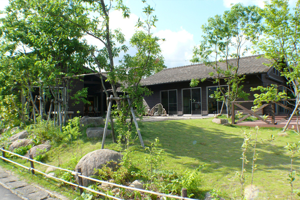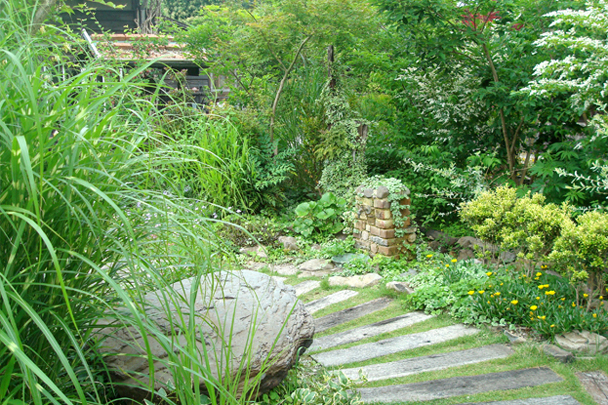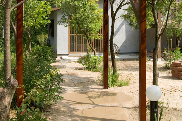 里山の雰囲気そのままに、自然素材を使い、雑草もお庭の一部に。