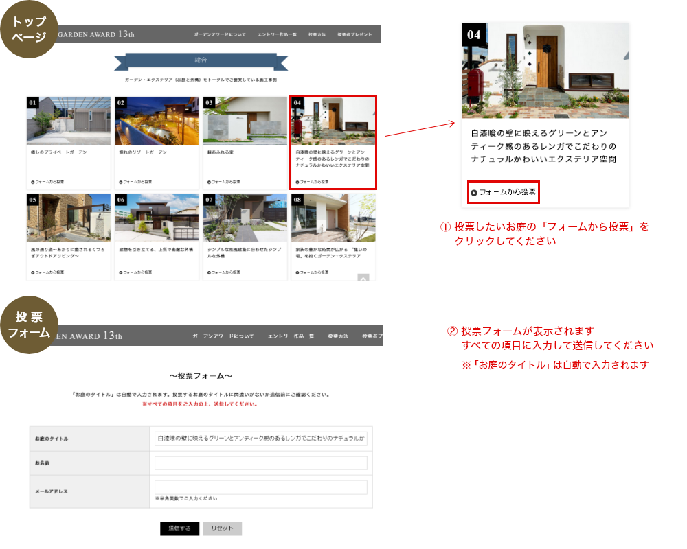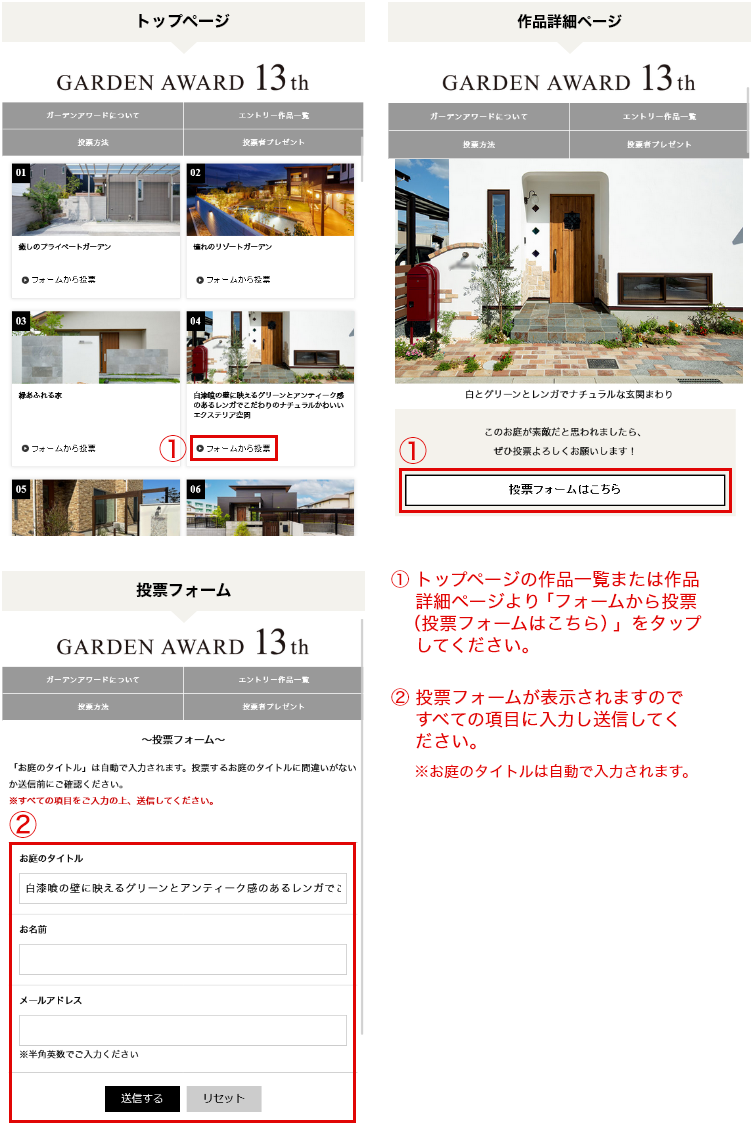 エントリー作品ページの「投票フォームはこちら」よりご投票ください。 ※同じお庭に対しての複数回の投票はご遠慮下さい。