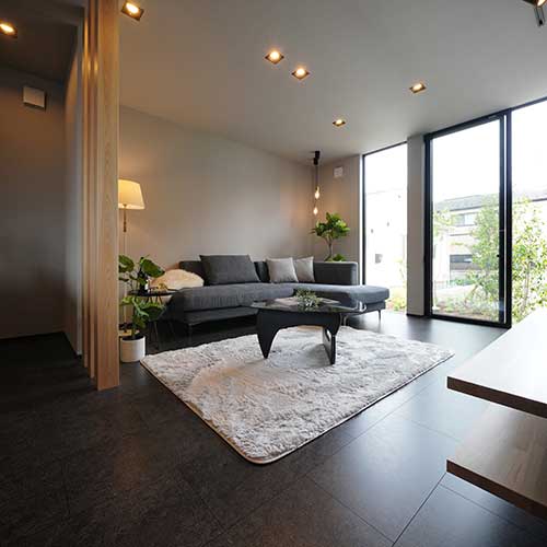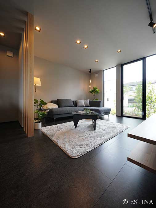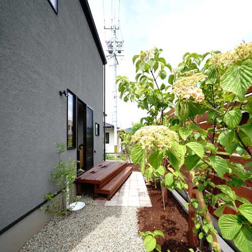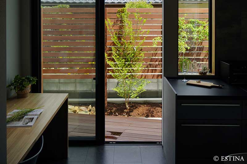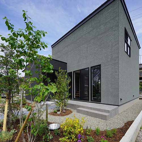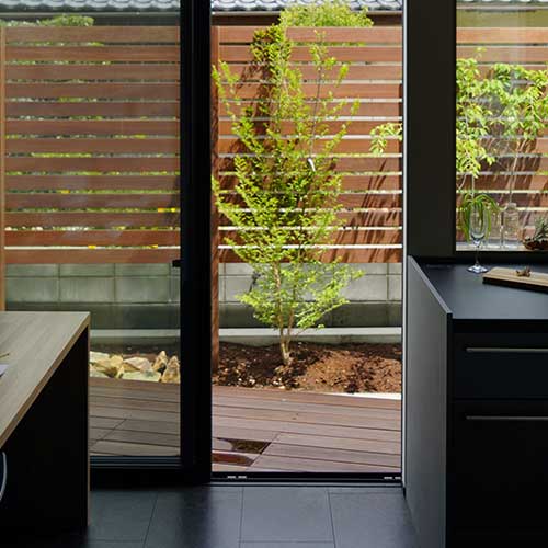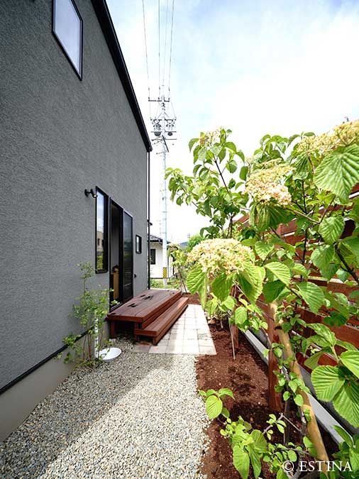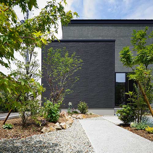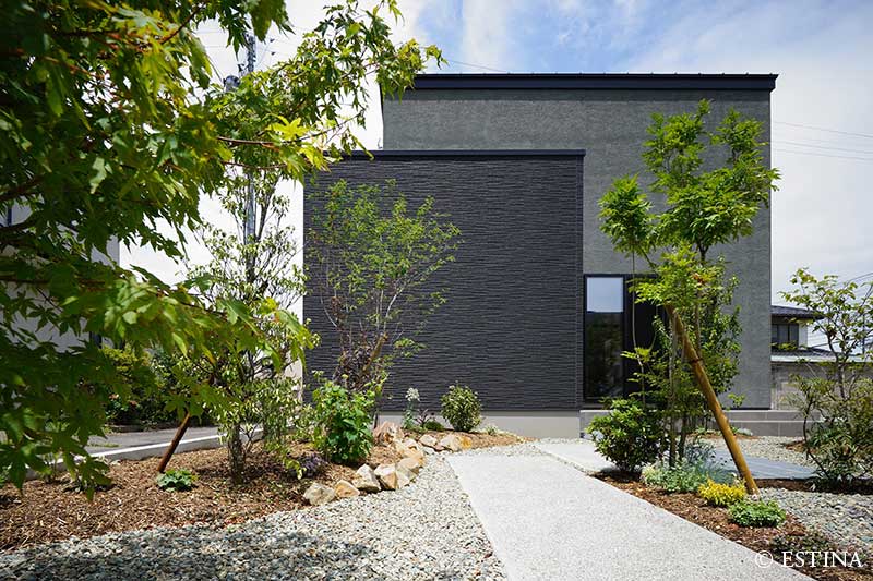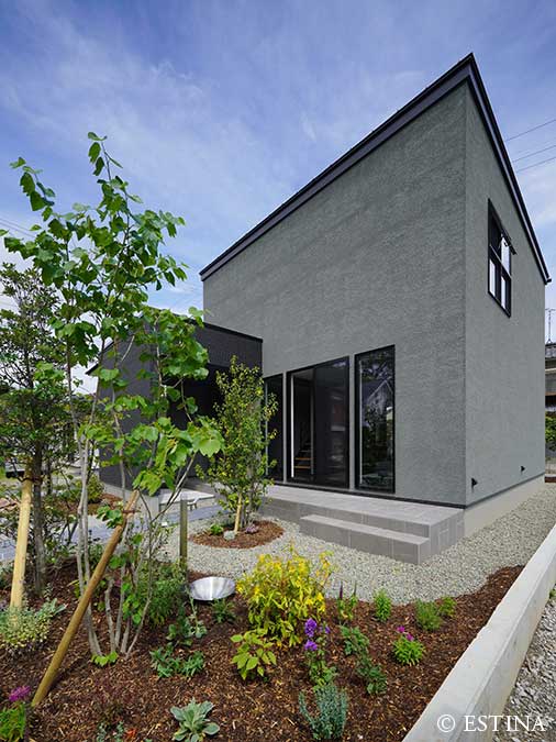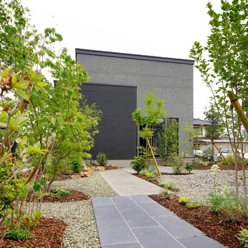 黒とグレイが基調のシンプルな建築に、季節を感じられる植物。家事や仕事の合間にふと窓の外に目をやると、庭のグリーンにほっと心が安らぐ。