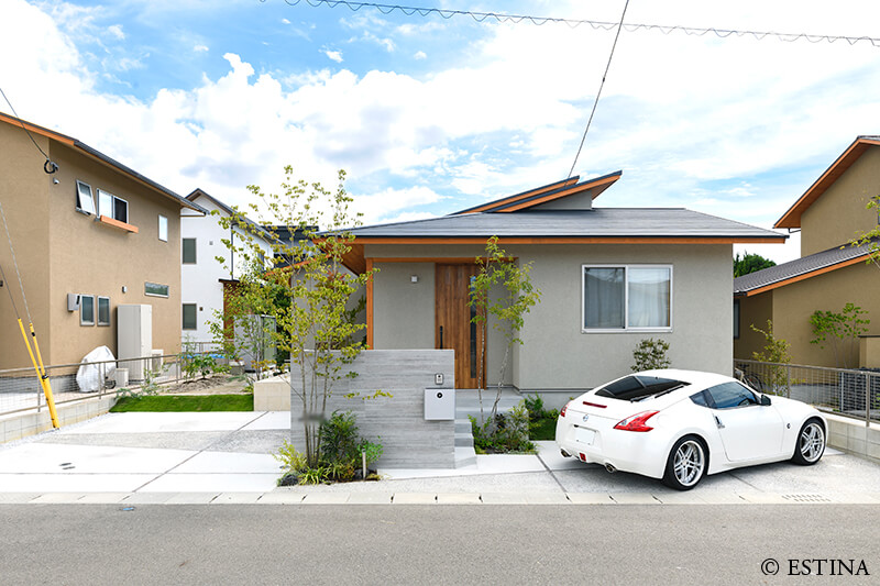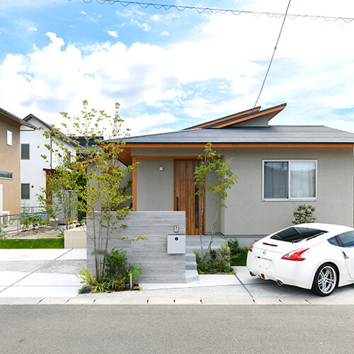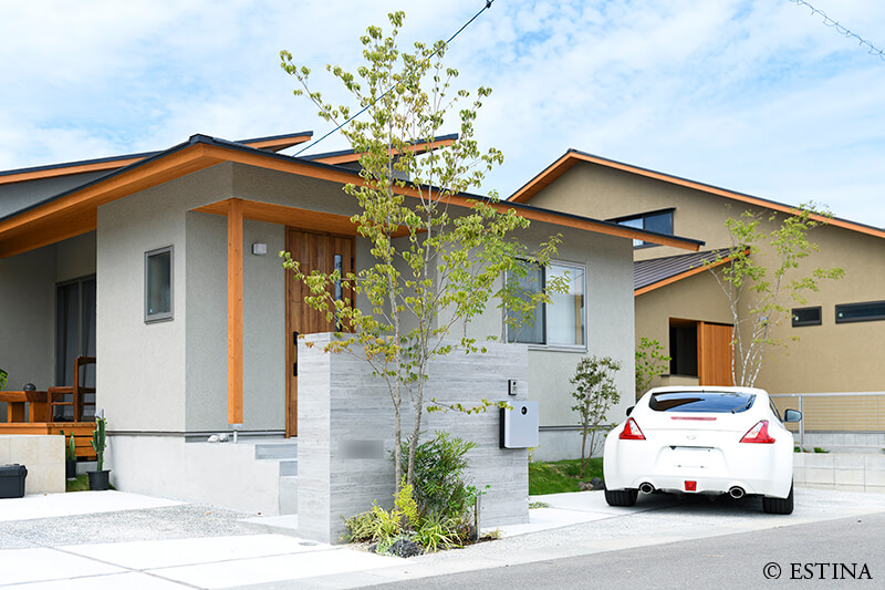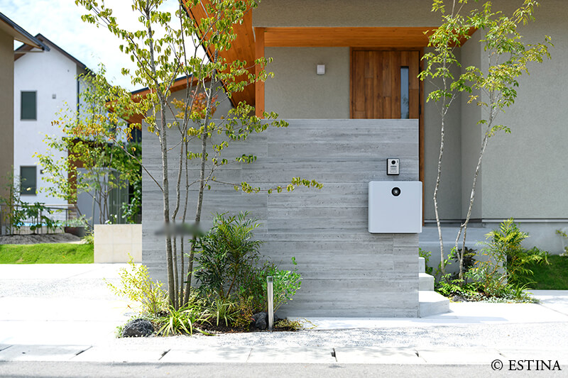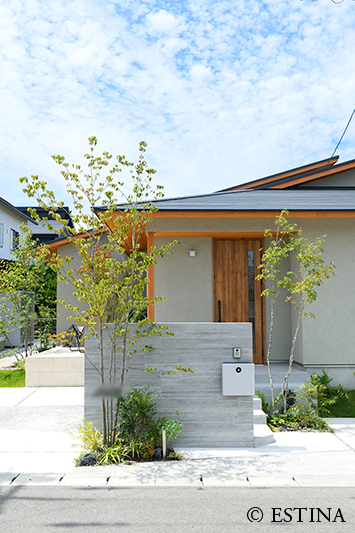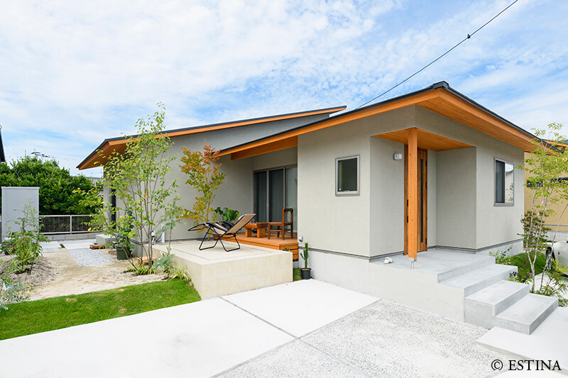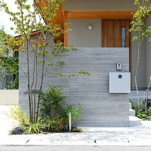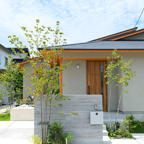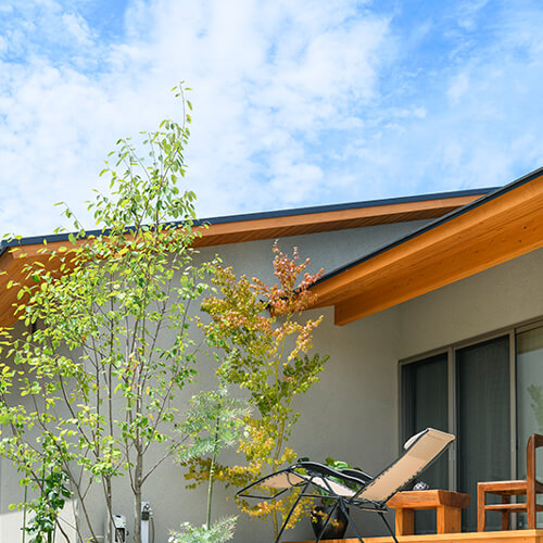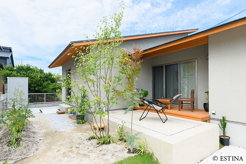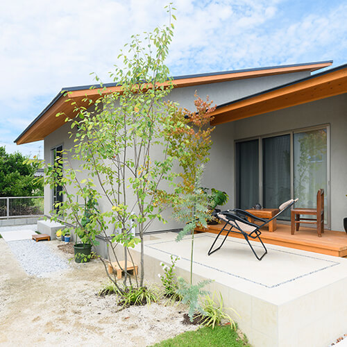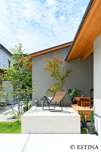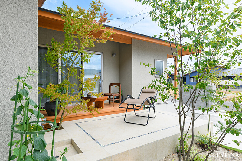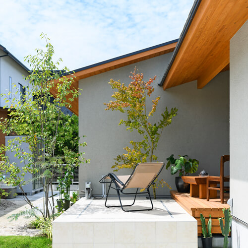 緑に包まれる、心地よいアプローチとテラス空間。ウッドデッキとタイルテラスを組み合わせ外と内を繋ぐ“中間領域”のある庭。