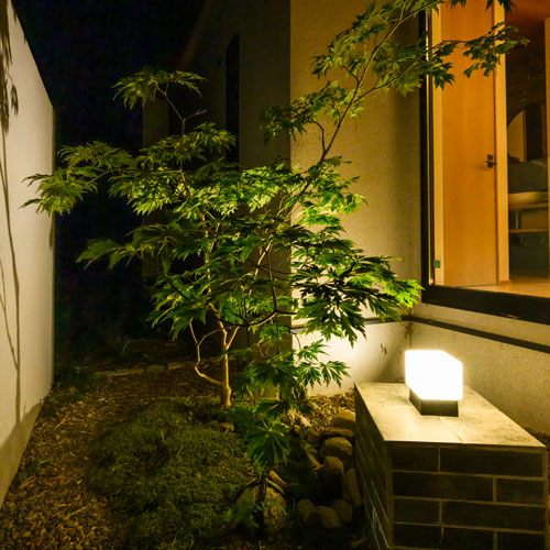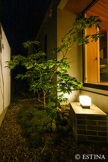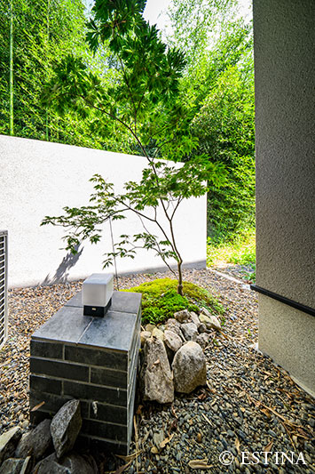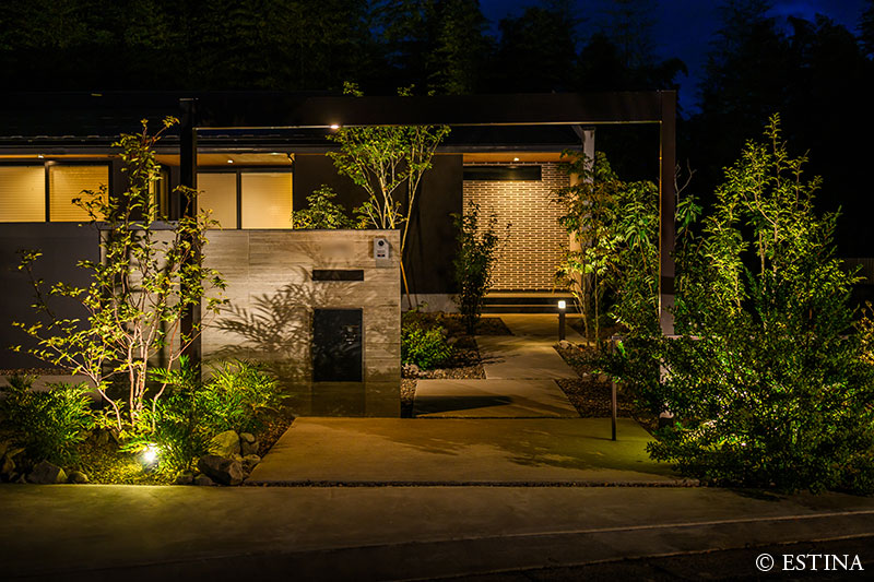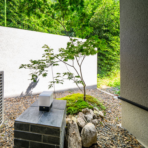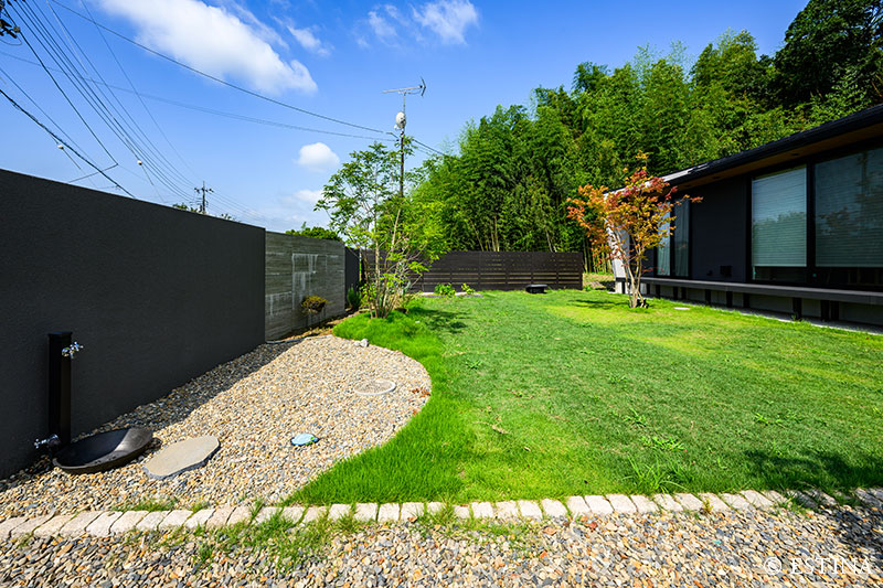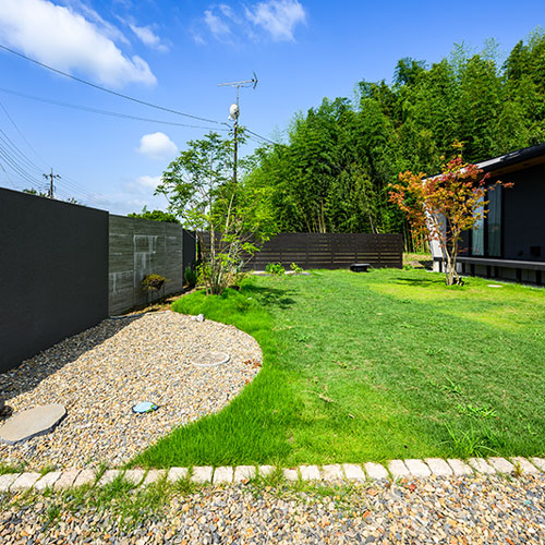 緑が家へやさしく誘う、落ち着きと開放感を両立した、心地よいプライベートガーデンのある平屋の新築外構。